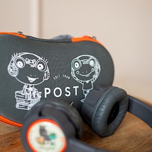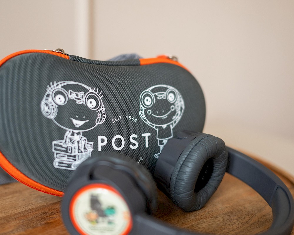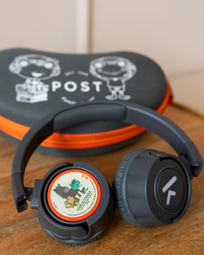 Die neue POST Family Hotel Kekz Edition ist ein echtes Highlight für kleine Hörspielfans. Die kabellosen Kekz Kopfhörer kommen in einem eleganten Grau mit liebevollen grünen Farbakzenten und sind mit den bekannten POST Maskottchen Unki & Unkine verziert. Robust, kindgerecht und einfach zu bedienen – perfekt für kleine Ohren und große Abenteuer.