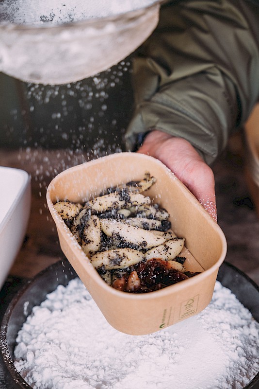 Schupfnudeln in siedendem Salzwasser ca. 10 Minuten ziehen lassen.Mohn-Zauber